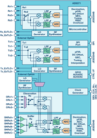 最新集成收发器产品包括AD9371,它是一款300 MHz至6 GHz直接变频收发器,具有两个接收通道和两个发射通道。接收和发射带宽可在8 MHz至100 MHz范围内调整,工作模式可配置为频分双工(FDD)或时分双工(TDD)。该器件采用12 mm2 封装,TDD模式下功耗约为3 W,FDD模式下功耗约为5 W。由于正交纠错(QEC)校准的优势,它实现了75 dB到80 dB的镜像抑制性能。