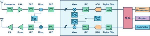 本文介绍如何利用一种高度集成的架构来应对上述挑战,该架构将AD9371收发器用作中频接收机和发射机,使得整个中频级及其相关器件都可以从系统中移除。文中比较了传统系统与提议的架构,并举例说明了如何通过典型设计流程来实现此架构。具体说来,使用集成收发器可以实现一些高级频率规划,这是标准超外差样式收发器做不到的。