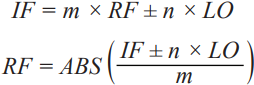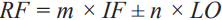 在此式中,RF为混频器输入端的RF频率,其导致一个信号音落在IF中。试举一例,假设接收机调谐到13 GHz,这意味着LO频率为18.1 GHz (5.1 GHz + 13 GHz)。将这些值代入上式,并允许m和n在0到3的范围内变动,则可得到如下RF公式: