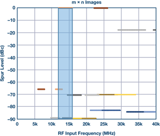 混频器依据公式m ×RF ±n ×LO产生输出信号和杂散,其中m和n为整数。接收信号产生的m ×n杂散可能落在IF频段中;某些情况下,目标信号音会引起一个特定频率的交越杂散。