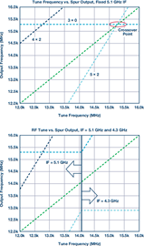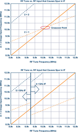 图9. 无IF灵活性时的m ×n交越杂散(上),利用IF调谐避开交越(下)