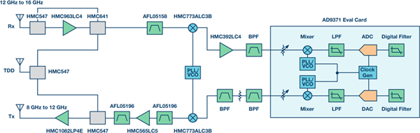为了展示这种架构能够实现的性能,我们利用ADI公司成品器件构建了一个接收机和发射机FDD系统原型,其接收频段的工作频率范围配置为12 GHz至16 GHz,发射频率的工作频率范围为8 GHz至12 GHz。使用5.1 GHz的IF来收集性能数据。接收通道的LO范围设置为17.1 GHz至21.1 GHz,发射通道的LO范围设置为13.1 GHz至17.1 GHz。原型的功能框图如图12所示。在该图中,X和Ku变频器板显示在左侧,AD9371评估板显示在右侧。