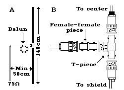 偶极子天线的原阻抗是75欧姆。由于偶极子的两半是对称的(即平衡的),和同轴电缆(不平衡的)连接时需要有一个“1:1 平衡-不平衡变压器(balun)” 。这个变换器最简单的制作办法是把电缆绕直径大约10-20cm的4-5个圈。 天线应该垂直放置, 在电缆和天线之间应该留出至少50cm空当。 | |