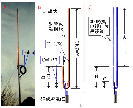 双线J极子天线有容易制作、便于携带、便于隐藏等特点(右图C)。关于双线J极子天线的详细介绍及制作步骤,请参看此文: “双线J极子天线的制作和测试”。