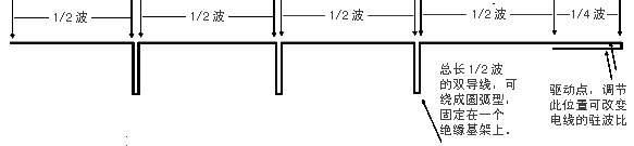基架实际上是靠得很近的两个平行导体。特定长度的发射元固定在基架的特定位置上,形成数个偶极子,每个偶极子的两半以轮换变化的形式接在不同的基架导体上(参见FigA)。偶极的数目与天线的带宽和增益有关。沿基架拉一根50欧姆的电缆(从长发射元端至短发射元端,如FigC的电缆是从铝管中间由A至B穿过去的),然后将电缆的芯线和屏蔽层分别接在两个基架导体上(短发射元端,如FigC中芯线接C处,屏蔽接B处),这样的结构形成了必要的阻抗变换器。