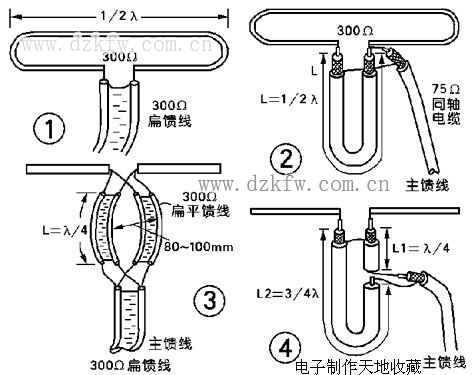 当馈线采用300ω扁平馈线时,需进行阻抗变换,方法是用1/4波长的扁平馈线两根制成阻抗变换器,接法如图3所示。