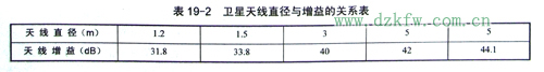 任何卫星天线都有一定增益,增益大小与天线的口径(口径直径)有关,一般来讲,直径越大,增益越高。卫星天线直径与增益的关系见表19—2。