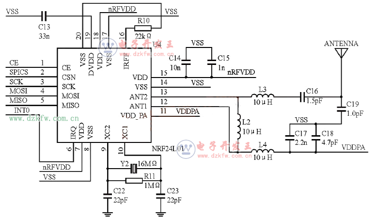 最简单无线发射电路图(三):基于nRF24L01的射频收发电路原理图