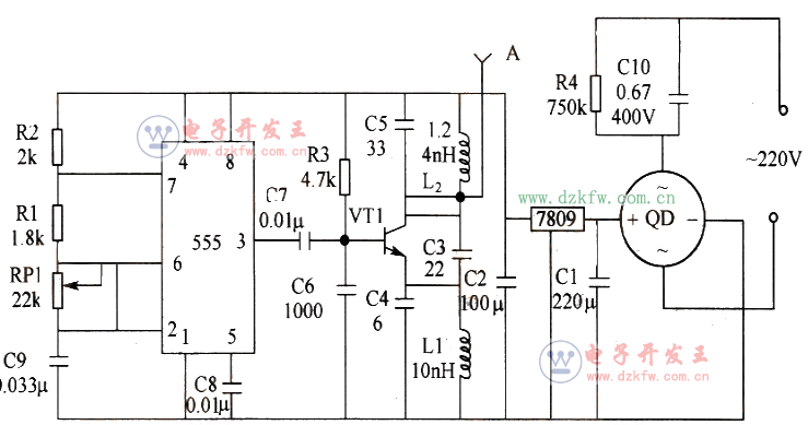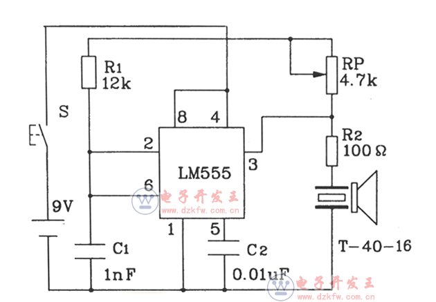 最简单无线发射电路图(一):555构成的超声波发射电路