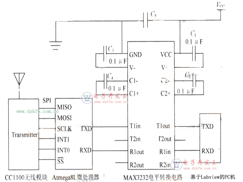 由于RS232串口的逻辑O规定为5~15V之间,逻辑1规定为一5~一15V之间。而单片机只能接收TTL电平(输入高电平》2.4V,输入低电平《0.8V,噪声容限为O.4V)。因此,Pc机与单片机之间并不能通过串口线直接进行通信,必须经过电平转换,在此选用MAXIM公司生产的.RS232接口芯片MAX3232,它使用单一电源电压供电,电源电压在3.0~5.5V范围内都可以正常工作。该系统采用了9针串口,通过3根线完成通信:RXD,TXD和GND,对应9针串口上的2号线、3号线和5号线。在系统设计中,芯片MAX323采用5.0V电压供电,单片机采用3.3V电压供电。因此,选择3.3V的稳压芯片AMSlll7—3.3,整个发射台可以通过USB接口从PC机取电。