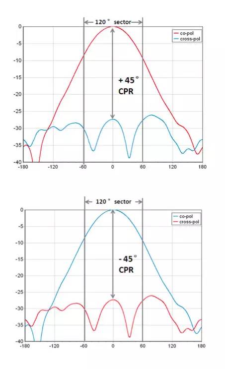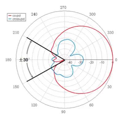 为了获得良好的上行分集增益,要求双极化天线应该具有良好的正交极化特性,即在±60º的扇形服务区内,交叉极化方向图电平应该比相应角度上的主极化电平有明显的降低,其差别(交叉极化比)在最大辐射方向应大15dB,在±60º内应大于10dB,最低门槛也应该大于7dB,如图所示。如此,才可以认为两个极化接收到的信号互不相关。
