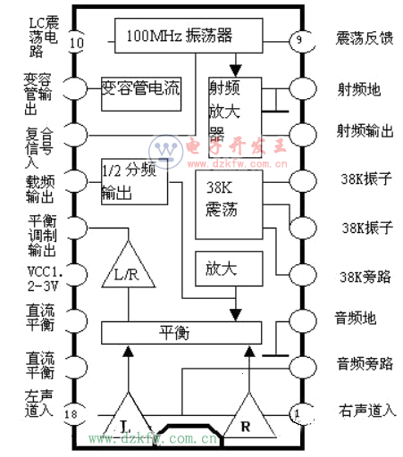 用BA1404制作调频立体声发射电路,BA1404为调频立体声发射专用集成电路,由于工作性能优良,也常用于无线电遥控.BA1404所需工作电源电压低1.5V~3V,功耗小,电路结构完善,所需外接元件少,工作稳定可靠. 不过想用好BA1404应注意以下事项: (1)为了使发射机的频率特性与FM广播接收机的频率特性一致,需在左、右声道输人端串接一个时间常数为50μs的预加重电路,如图所示。当用于无线电遥控发射电路时,可将左、右输入端合并,用0.1~1μF电容与信号输入端连接。 (2)12~14脚外接R、C元件,是保证立体声调制器的输出信号与导频信号组合成复合信号时,两者相位特性一致,不使声道分离度恶化,一般情况下不得变更。如需变更应进行实际试验后确定。 (3)立体声调制时,调制信号的声频上限为19kHz,若输入信号中伴有脉冲性信号,为了防止出现蜂音和声道分离度恶化,应在输入端串接低通滤波器。 (4)16~17脚是用于调节平衡的引脚,这两脚即使什么也不接,也可以获得满意的分离度。在通常的使用中总是接一个50kΩ的电位器,通过调节直流平衡,使分离度进一步提高。 (5)11脚的直流输出电压由内部电路固定为VDD~0.7V。