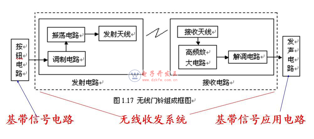 门铃电路只是无线通信系统的一个特例,假如基带发生电路所产生的是语音信号,经过无线收发电路传输后,还原的基带信号(语音信号)用来驱动啦叭,这样组成的通信系统就是广播系统。