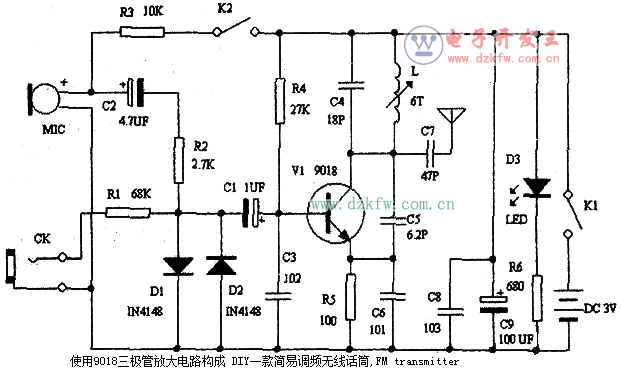 电路中Kl和K2是一种开关,它有三个不同的位置(这里未绘出,只加说明),拨到最左边时断开电源,最右边是Kl、K2接通做调频话筒使用,中间位置是Kl接通,K2断开,做无线转发器使用。