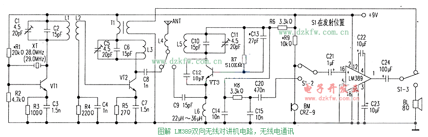 石英晶体XT、VT1等组成高稳定度的载波振荡器.振荡信号由L1耦合至L2.由VT2进行载波功率放大。C1、C2、L1和C5、C6、L3组成两个并联选频回路.当它们的谐振频率与XT固有振荡频率一致时.可获得最大的发射功率,一般通话距离可达2.5km~3km。当S1置发射位置时(附图所示位置),话筒BM拾取的音频信号经LM389进行功率放大,加至调制变压器T1,通过音频信号电平高低不同,控制载波功率放大管VT2的工作电压,实现对振荡信号的幅度调制(调幅),然后经C8、L4送至天线ANT.向空间发射。R1、R2决定、VT1工作点。