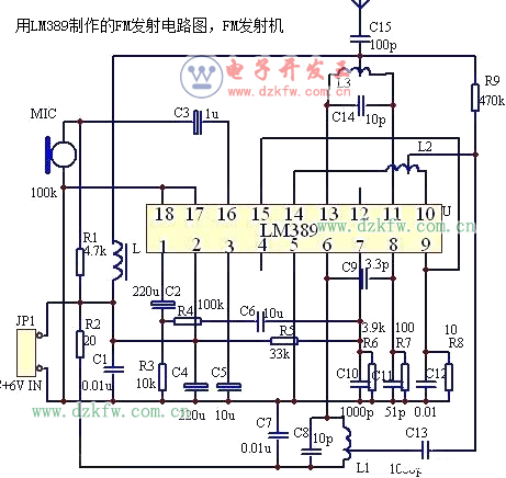 下图为用美国NS公司的集成电路制作的一款远程无线发射电路,不难看出,实际上就是利用它的音响放大部分作为话筒的音频放大,然后利用1脚输出的音频信号来调制后级的高频振荡部分,高频振荡就利用它内部的高频三极管来完成。它配合良好的调频收音机可以发射1KM的距离,电路中的电感用直径0.50mm的漆包线绕成直径6mm的空心线圈,其中心抽头.具体是L1,L3均为6匝,中心抽头. L2为3匝,中心抽头.其性能要比晶体管制作的电路较稳定.以下是实际制作的图片和电路原理图.爱好者可以自已动手制作。