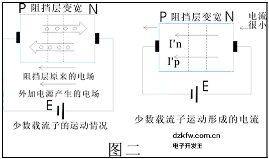 由于外加电源电压产生的电场方向正好和阻挡层内正、负离子产生的电场方向相反,这就使阻挡层内总的电场减弱,可见有了名加正向电压时,原来阻挡层内扩散作用和漂移作用的平衡就被破坏了。扩散作用占了优势。于是,P区中的多数载流子空穴,就很容易穿过阻挡层扩散到N区,形成空穴电流Ip;同时,N区中的多数载流子,也很容易穿过阻挡层扩散到P区,形成电子电流In。空穴电流和电子电流的方向都是从P区流向N区的,于是在外电路中,PN结的正向电流为二者之和,即I+=Ip+In。如果把正向电压销加大一点,阻挡层中总的电场也就再减弱一些,就会有更多的P区的空穴扩散到N区,使电子电流增大。所以PN结正向导电时,其正向电阻很小,正向电流较大,并且正向电流随外加电压的增加而增大。