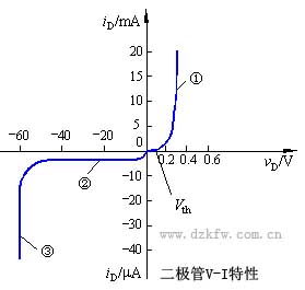 正向特性表现为图中的①段。此时正向电压较小,正向电流几乎为零。此工作区域称为死区。Vth称为门坎电压或死区电压(该电压硅管约为0.5V,锗管为0.1V)。当正向电压大于Vth时,内电场削弱,电流因而迅速增长,呈现出很小的正向电阻。