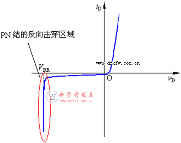 当PN结外加反向电压|vD|小于击穿电压(VBR)时,iD≈–IS。IS很小且随温度变化。当反向电压的绝对值达到|VBR|后,反向电流会突然增大,此时PN结处于“反向击穿”状态。发生反向击穿时,在反向电流很大的变化范围内,PN结两端电压几乎不变。