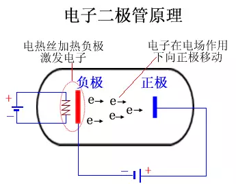 1904年,英国物理学家弗莱明根据“爱迪生效应”发明了世界上第一只电子二极管——真空电子二极管。它是依靠阴极热发射电子到阳极实现导通。