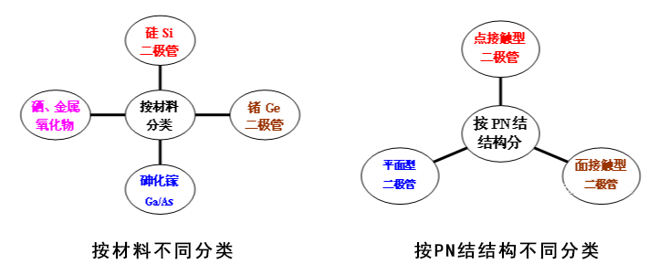 当外加电压方向由P极指向N极时,导通。 晶体二极管分类 晶体二极管可按材料不同和PN结结构不同,进行分类。