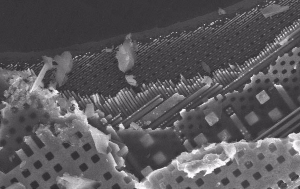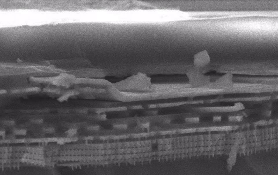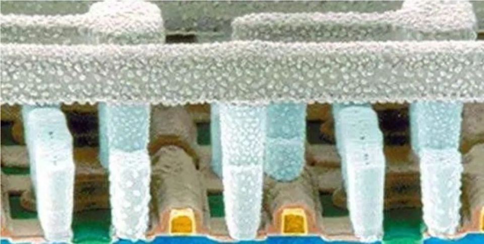 这是一个Top-down View 的SEM照片,可以非常清晰的看见CPU内部的层状结构,越往下线宽越窄,越靠近器件层。