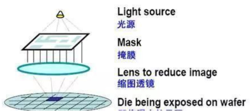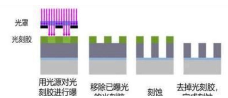 利用光刻机发出的光通过具有图形的光罩对涂有光刻胶的薄片曝光,光刻胶见光后会发生性质变化,从而使光罩上得图形复印到薄片上,从而使薄片具有电子线路图的作用。