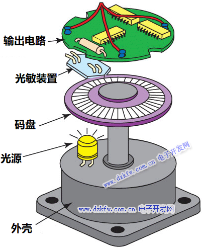 光电编码器(optical encoder)的组成包括:连接轴(Shaft)、码盘(Code disk)、光源(Light Source)、输出电路(Output circuit)及外壳和连接法兰等,如下图: