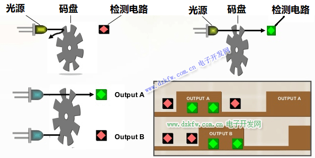 通过调整码盘光栅的间隔距离及两个光源的位置,使A相信号和B相信号相差1/4周期(相位角差90度),这样就可以通过判断A相信号和B相信号的发生顺序来判断正转还是反转。该方法的示意图如下: