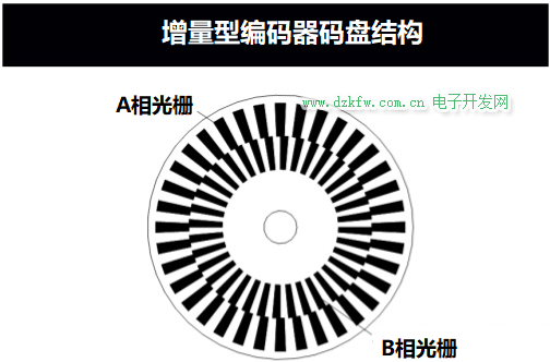 该方法使用具有2圈光栅的码盘,外圈为A相光栅,内圈为B相光栅,两圈光栅之间间隔1/4宽度,如下图所示: