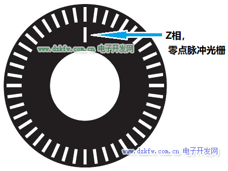 除了A/B相,在实际应用中,有的编码器还提供零点脉冲信号。零点脉冲信号是在码盘上增加一个同心的光栅孔,每转一圈发出一个脉冲,其输出信号称为Z相(Zero),如下图: