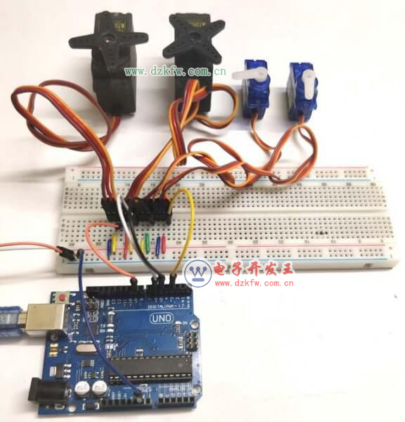 需要注意的是,当使用外部电源对舵机供电时,需要将外部电源的GND与Arduino的GND连接起来,形成电路的等电位连接,否则会造成运行不稳定或存在干扰。