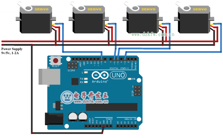 在本文中,我们将向您展示如何使用Arduino来控制多个舵机。用Arduino连接单个舵电机是很容易,但是如果我们把所有的舵机都连接到Arduino的电源引脚上,它们就不能正常工作了,因为Arduino的电流不足以驱动所有舵机。因此,使用Arduino来控制多个舵机,你必须使用单独的电源。如,5v-2A的独立电源或9v的电池。