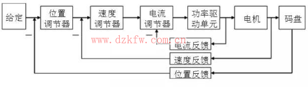 有刷直流伺服电机驱动器:电动机的工作原理和普通的直流电机完全相同,驱动器为三闭环结构,从内到外分别为电流环、速度环、位置环。电流环的输出控制电机的电枢电压,电流环的输入为速度环PID的输出,速度环的输入为位置环的PID输出,位置环的输入即是给定输入,控制原理图如上图。
