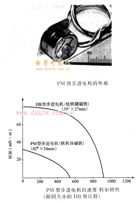下图示为PM型步进电机的外观及PM型步进电机(42×长度27mm,步距角7.5°)的速度-转矩特性[与尺寸接近的 HB型步进电机(39×长度27mm,步距角1.8°)比较]。因为HB型为方形,其对角线为42mm以上,而且转子为永久磁铁,PM型为便宜的铁氧体磁铁,HB为钕铁硼磁铁,极对数相同,且PM型的气隙比HB型大3倍以上,故转矩差如此之大也是必然。关于最高转速和电气时间常数(线圈电感除以电阻之值)的差异,仅供参考。