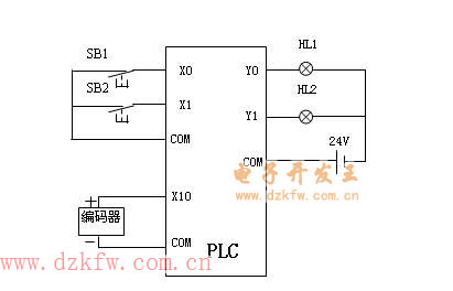 常用的旋转编码器有5条引线,其中3条是脉冲输出线,1条是COM端线,1条是电源线(OC门输出型)。电源可以是外接电源,也可直接使用PLC的电源。电源“-”端要与编码器的COM端连接,“+ ”与编码器的电源端连接。编码器的COM端与PLC输入COM端连接,A、B、Z两相脉冲输出线直接与PLC的输入端连接,A、B为相差90度的脉冲。旋转编码器还有一条屏蔽线,使用时要将屏蔽线接地,提高抗干扰性。