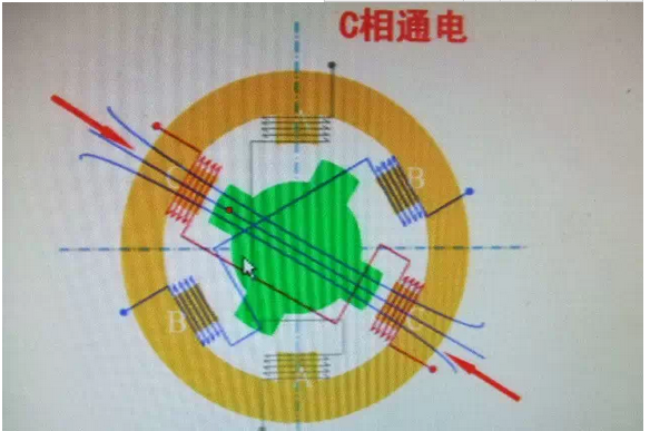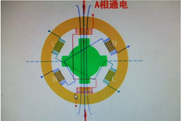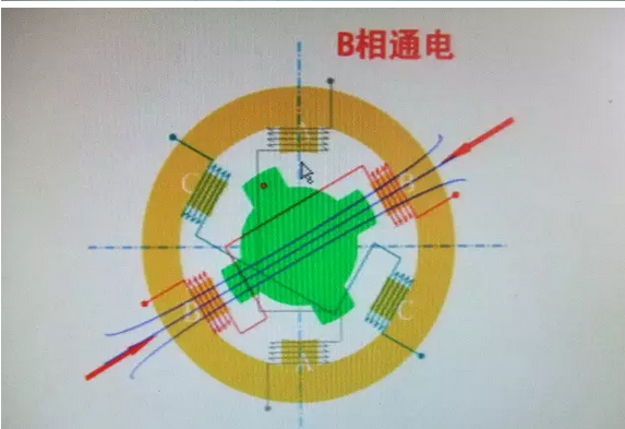 当某相定子励磁后,它吸引转子,转子的齿与该相定子磁极上的齿对齐,转子转动一个角度,换一相得电时,转子又转动一个角度。如此每相不停地轮流通电,转子不停地转动。