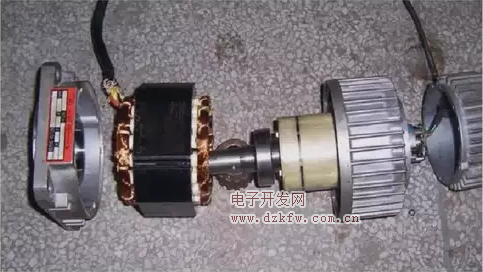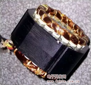 我们来看交流伺服电机定子的结构,如下图,伺服电机的定子由铁芯和绕组构成。我们这里讲的是三相交流伺服电机,所以它的定子分成三相绕组结构。定子的功能是通过三相交流电产生一个旋转磁场,其工作原理和普通三相电动机是一样的。