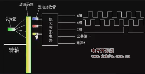 编码器的工作原理:如下图,发光管发光通过玻璃码盘的条纹由光电接收管接收,当电机旋转时码盘跟着转动,由于码盘上是一些明暗相间的条纹,所以光电接收管接收到的就是一些光脉冲,光电接收管把光信号转换成电信号,电信号再通过放大整形电路转换成我们需要的矩形脉冲。由于码盘上A相和B相所刻的条纹是相间隔的,因此放大整形电路输出的A相和B相脉冲存在一个相位差,这里我们要求A相和B相脉冲的相位差为90度。由于码盘上Z相只刻有一个条纹,所以电机旋转一周只产生一个Z相脉冲。我们这里所讲的编码器为相对式编码器,编码器除了相对式编码器还有一种为绝对式编码器,有些伺服电机也会采用绝对式编码器。