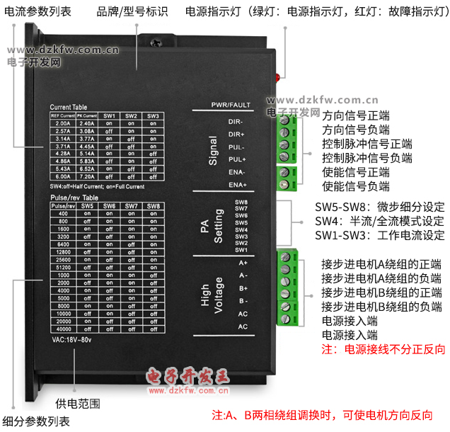 6、接电机相线端子:接电机线。任意对调A相、或者B相绕组接线,可以改变电机运行方向。不同电机绕组接线方式请参考两相步进电机接线分析。