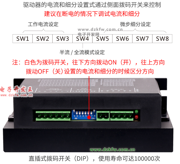1、拨码开关(如下图):用于驱动器的工作电流,细分,半流/全流等参数的设置。