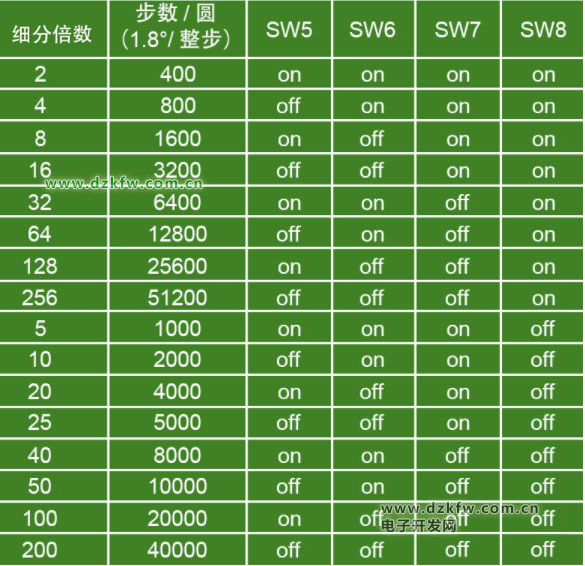3、细分参数列表(如下图):细分的概念是将上级装置发出的每个脉冲按步进电机驱动器设定的细分系数分成系数个脉冲输出。比如步进电机每转一圈为200个脉冲(电机转一圈360°每接收一个脉冲电机转1.8°),如果步进电机驱动器细分倍数为32,那么步进电机驱动器需要输出6400个脉冲步进电机才转一圈。而用户可以根据步进驱动器上的细分表设置拨码开关(见下文),设置到自己需要的参数。