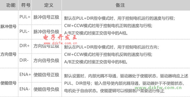 补充:1)有些品牌步进驱动器上有模式设置表,在拨码开关上设置对应模式,本文以PUL+DIR指令模式为例。2)还有些步进驱动器输入使能信号不可以设置;不导通使能信号,电机处于锁轴状态。导通使能信号,电机处于自由状态。