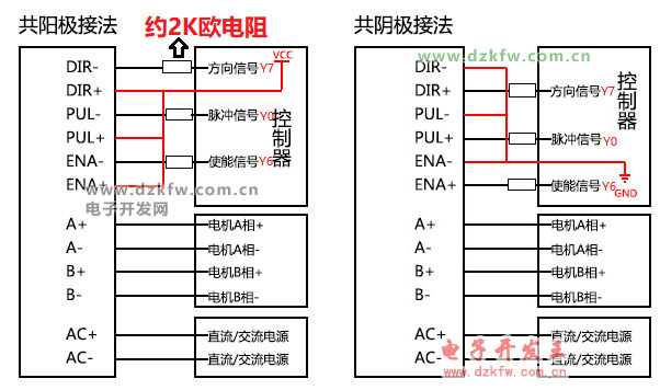 以上是用最简单的按钮方式发送脉冲信号给步进驱动器来控制步进电机。也可以用PLC高速脉冲输出点发送脉冲给步进驱动器。可以分为共阳极和共阴极两种接法。(如下图)在PLC程序写PLSY指令输出脉冲,关于PLSY指令内容在下面做详细讲解。