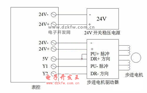 3、将步进电机驱动器方向输入信号的负端连接到表控的Y2输出端子上。