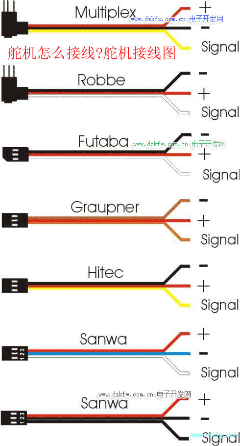 舵机都是用信号线的颜色来区分功能的,中间的红色线是电源正极,棕色线是电源负极,剩下的橙色线是控制线。