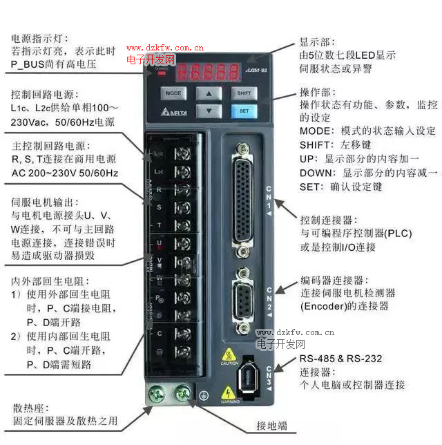 驱动器主要有控制回路电源、主控制回路电源、伺服输出电源、控制器输入CN1、编码器接口CN2、连接起CN3。控制回路电源是单相AC电源,输入电源可单相、三相,但是必须是220v,就是说三相输入时,咱们的三相电源必须经过变压器变压才能接,对于功率较小的驱动器,可单相直接驱动,单相接法必须接R、S端子。伺服电机输出U、V、W切记千万不能与主电路电源连接,有可能烧毁驱动器。CN1端口主要用于上位机控制器的连接,提供输入、输出、编码器ABZ三相输出、各种监控信号的模拟量输出。