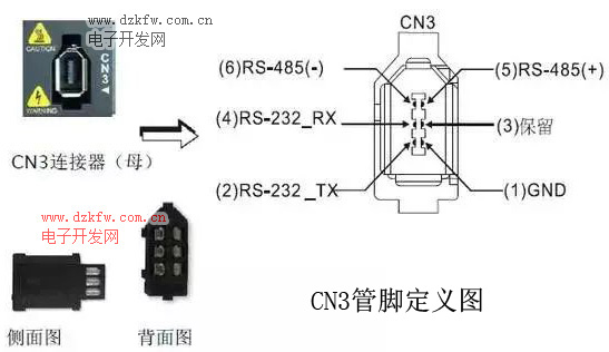 驱动器通过CN3端口与电脑PLC、HMI等上位机相连接,采用MODBUS通讯来控制驱动器,可使用RS232、RS485进行通讯。