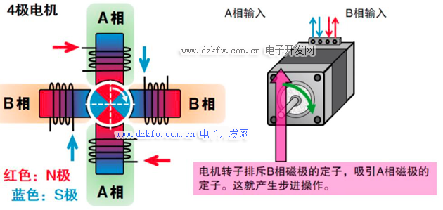 如上图所示,电机的运动是通过改变电流在电机中的流动来实现的,电子转子排斥B相磁极的定子,吸引A相磁极的定子,这就产生了另一个步进操作。