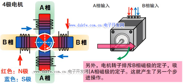 执行另一个步进操作,电机定子磁极反转,转子排斥B相磁极的定子,吸引A相磁极的定子,如上图所示。